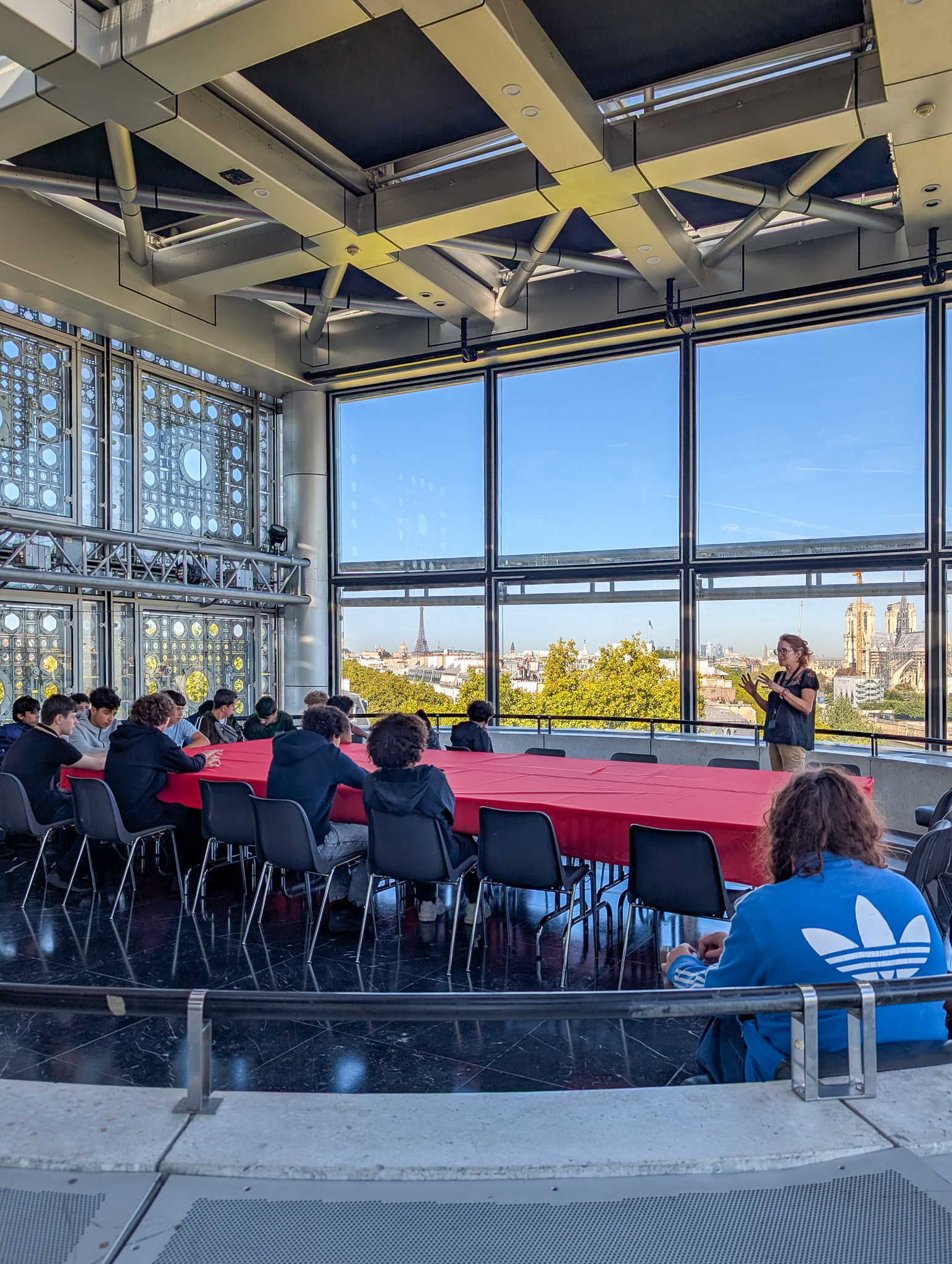 L’Institut du Monde Arabe, avec ses façades emblématiques et ses jeux de lumière à travers des moucharabiehs modernes, incarne à la perfection cette rencontre de deux cultures, alliant tradition et modernité. La visite a permis aux élèves de mieux comprendre l’importance de cet édifice, à la fois musée, centre culturel et espace de réflexion sur le monde arabe dans ses diverses expressions.